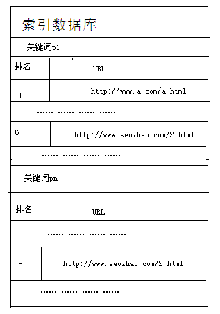 假若http://www.seozhao.com/2.html页面被切词成p={p1,p2,p3,……,pn},则其在索引数据库中由下图方式体现。