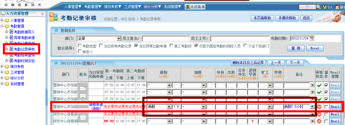 关于您提到的浏览界面还可以看到的问题,在人力资源管理模块-》考勤管理-》考勤记录审核中可以将该条考勤申请取消的,取消后就看不到了: