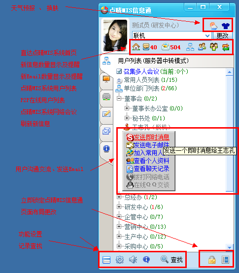 点晴MIS信息通是点晴公司基于点晴MIS系统推出的在PC上运行的独立企业IM交流系统(类似于腾讯RTX基于企业内部组织机构及人员的沟通工具),是点晴MIS系统在PC上的有力帮手和功能补充。