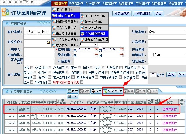 点晴模切ERP销售部下推发货通知