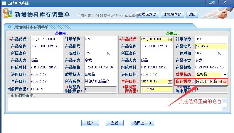 选择正确的货位后点击“提交”即可。