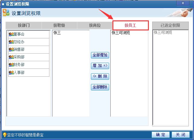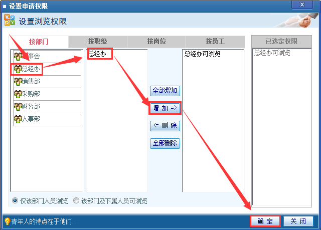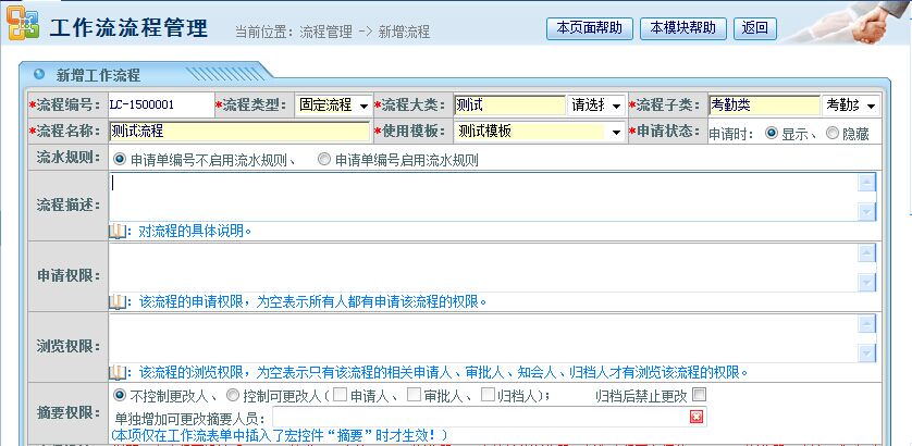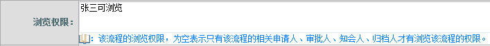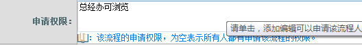 进入流程设计页面;如下图所示: ”流程编号“为系统自动生成。 二:编辑相关权限(注:普通流程此处可留空,即:所有人员都能进行流程申请和浏览) 1.编辑申请权限;点击输入框,弹出如下图所示页面: 2.编辑浏览权限 与申请权限编辑类似;也可按照其他分类进行对应选择:如下图所示: 该文章在 2015/3/19 18:15:38 编辑过 |
