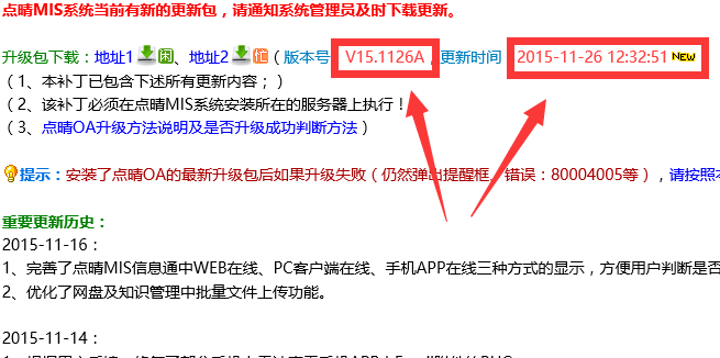 由于点晴OA系统的安装程序制作比较麻烦、而升级包的制作则十分简单方便,正常情况下,一般点晴OA安装程序一年只更新1~2次,所以用户安装的点晴OA正常情况下并不是最新版本。管理员安装点晴OA系统完毕后,应该立即在OA服务器上下载以下最新版升级包,将点晴OA服务器升级到最新版本。