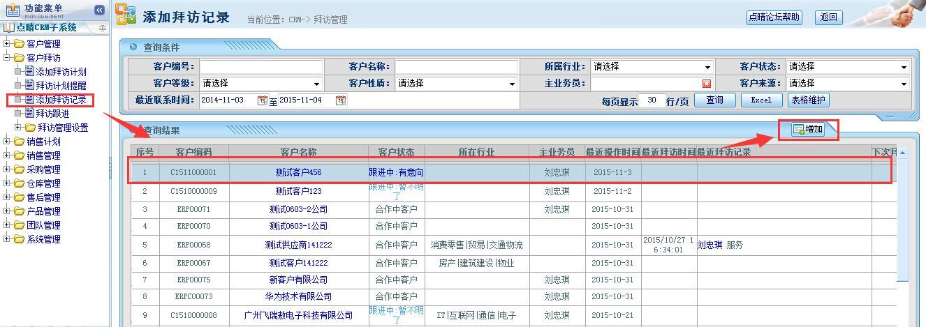 1、进入添加拜访记录页面,找到想要填写拜访记录的客户,点击客户后,点击增加按钮
