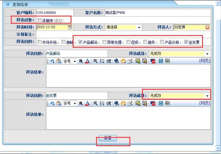 选择拜访的对象、拜访的目的、拜访成效、拜访内容、点击“新增”就可以了