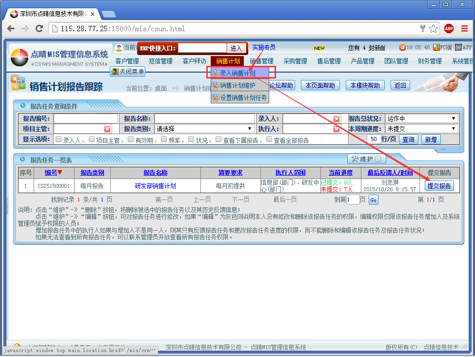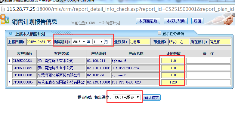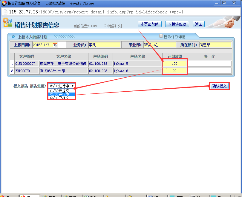 点晴CRM系统销售计划录入 操作步骤:录入销售计划——点击提交报告按钮;如图: 进入页面:录入客户产品需求值——选择报告进度——点击“确认提交”按钮即可如图所示: 该文章在 2016/4/8 15:09:20 编辑过