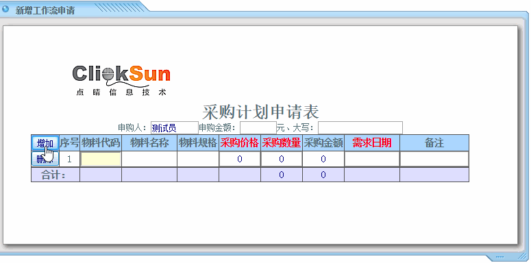 :问下,要做一个采购申请的模板,有没有如果明细部分行数不够可以由申请人自己添加的功能?并且希望实现部分控件禁止录入、禁止为空、显示合计、自动转换大写金额、设置预置数据以便选择等效果。![]() 可以,利用点晴OA系统工作流表单模板中的行输入宏控件,可以方便的实现采购单等需要填报多行信息的需求。 效果展示视频: 附件:工作流行输入宏控件效果展示.wmv ![]() 进入工作流模块,新增模板或编辑模板: 勾选“启用行输入宏控件”,就会在模板编辑器中看到增加了一个“$input_rows$”,这个就是行输入宏控件,将它挪到需要填写的适当位置。 然后维护这个行输入宏控件中各个列字段,通过适当的使用数据源功能,可以实现多个字段的自动填充、禁止录入等,无需用户手工填写: ![]() 在上面“数据来源”列,可以绑定预置数据,绑定数据源方法参考下面教程,可以实现用户点击时,自动弹出页面选择预置的内容,也可以设置“禁止录入”实现允许或禁止用户更改内容: 下面是用户申请采购单时的效果: ![]() 更多详细操作帮助参见:
