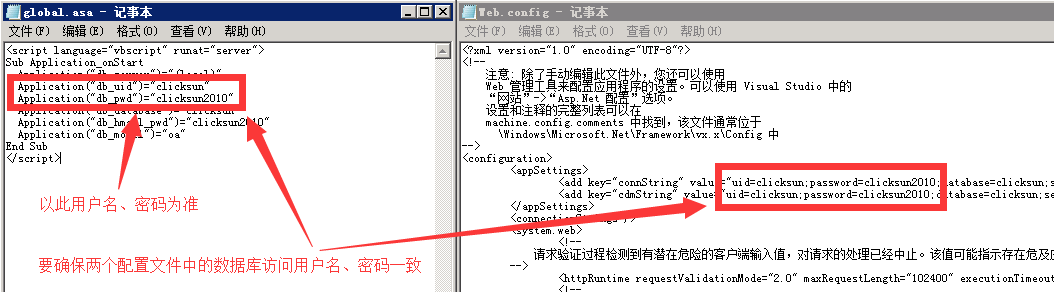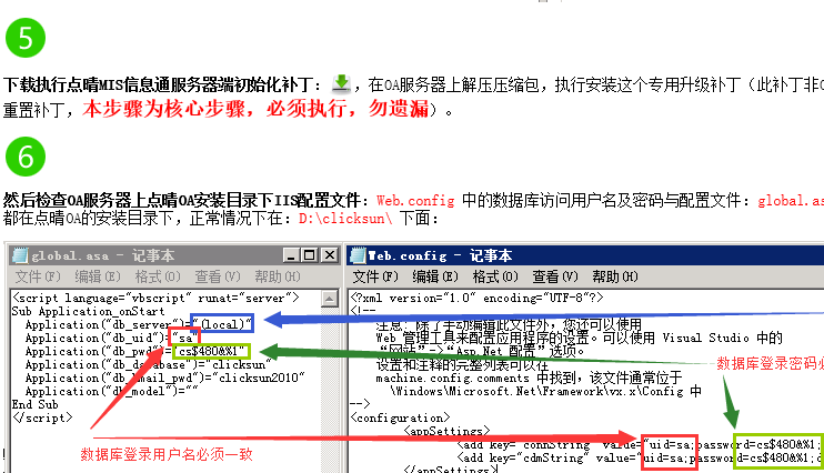 注意上面的global.asa是使用单位OA服务器上点晴OA安装目录下的数据库配置文件,数据库访问用户名及密码不一定与上面左边 global.asa 显示的相同,以实际看到的为准,然后将上面右边所述 web.config 数据库访问的用户名及密码改为与 global.asa 一致即可。