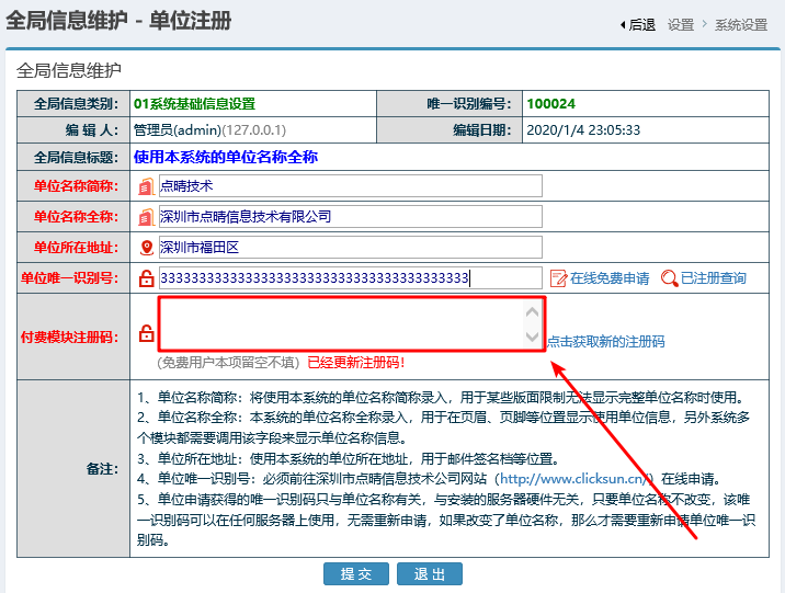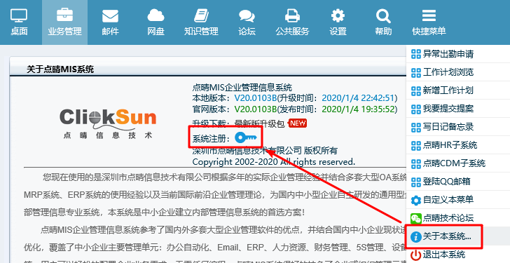 填入专业功能付费注册码,将付费后点晴公司提供的付费注册码保存到以下位置(点晴OA-》快捷菜单-》关于本系统...-》系统注册
