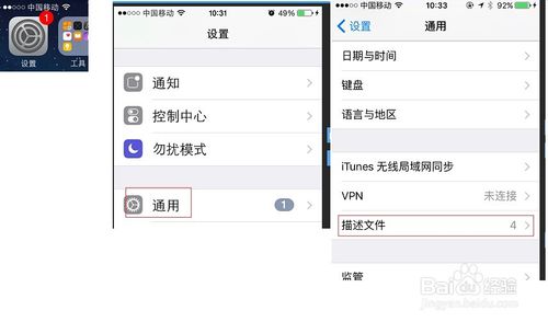 因苹果公司的政策原因,在iOS9.0以后版本的苹果手机中首次安装企业版APP应用时,会出现上面这个"未受信任的企业级开发者"提示,导致无法启动APP,需要通过以下方式解决这个问题:点击 设置-》通用-》描述文件-》找到描述文件点开“信任”就可以了,下面演示一下: