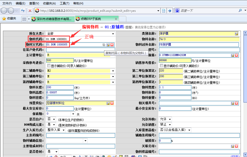 原因2:对应材料有库存,但材料基础资料绑定父代码错误;如下图所示: