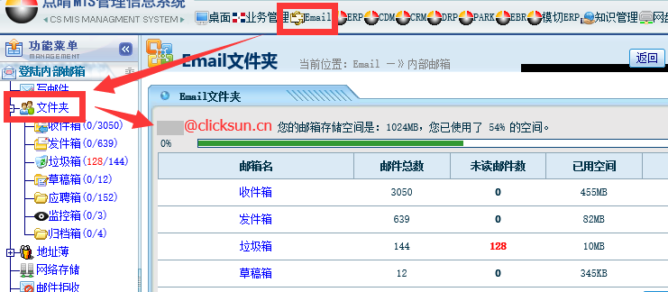 :点晴OA中用户网盘和Email占用的磁盘空间大小在哪里能够查看到?如果用完了怎么办?![]() 在Email模块中,点击“文件夹”,就可以看到当前用户已经占用的邮件空间大小和剩余可用空间大小: