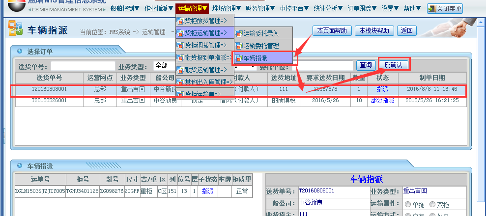 驳回完成后;回到车辆指派界面进行反确认操作;操作步骤:运输管理——货柜运输管理——车辆指派——选择对应的运输单——点击“反确认”按钮;如下图所示:
