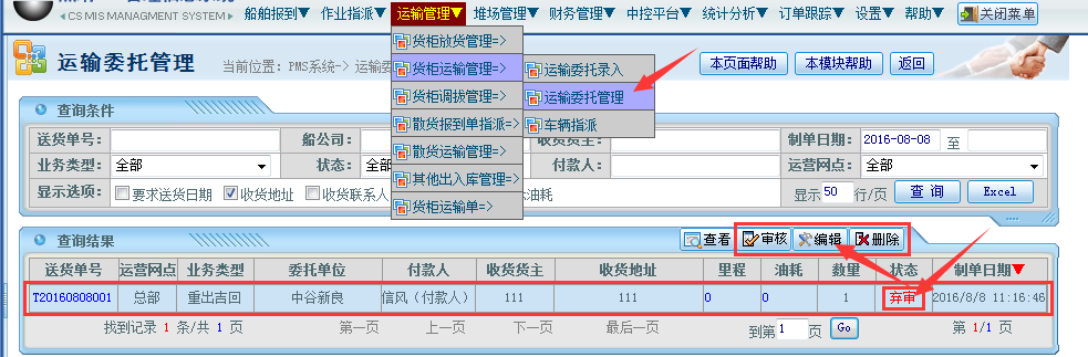 操作步骤:运输管理——货柜运输管理——运输委托管理——选择对应的“制单”状态单据——点击编辑按钮;如下图所示: