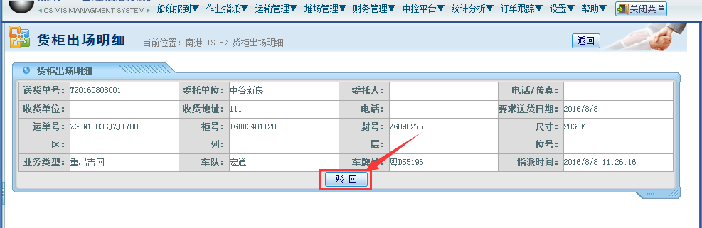 操作步骤:堆场管理——货柜出入场管理——运输出入管理——汽运出场;选择对应的运输明细——点击“驳回”按钮;如下图所示: