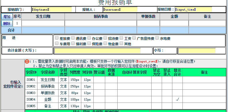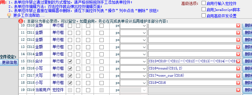 :工作流表单模板中设置的自动合计和相加字段为什么在实际申请使用中不生效,要如何处理?![]() ![]() 注意1: 点晴OA工作流中自动合计以及其他计算公式的实现是通过JS实现的,JS中的“+”是连字符,不是数学意义上的数字相加减,JS中的数字相加必须通过“-(-*)”来实现。 例如:JS中的3+5=35,而不会8,要实现等于8,必须用:3-(-5),才会得到8! 注意2: 凡是参与合计预算的数字型字段,默认值都必须设置为0,否则为空的字段会导致合计失效。 上面这个例子中:CS10、CS11、CS12、CS13、CS14的默认值都必须设置为0,否则填写表单时,这几个字段中任何一个字段为空,都会导致合计失效。 注意3: 点晴OA工作流自动合计计算的自定义公式中是不支持变量嵌套的,必须全部使用第一手数据! 例如上面这个:CS16=round(CS15,2),其中的CS15就是通过上一行公式动态得到的,所以按照上面的规则,CS16一定会有问题,申请时会看到不管如何改变上面的值,CS16都会为空而不会自动改动! CS17=conv_cur(CS16)、CS18=CS16,都存在着同样的问题! 解决办法: 将最开始CS15的计算公式直接写入到下面要引用的公式中即可,例如上面这个CS16、CS17、CS18,应该改为: CS16=round((CS10-(-CS11)-(-CS12)-(-CS13)-(-CS14)-(-CS9)),2) CS17=conv_cur(round((CS10-(-CS11)-(-CS12)-(-CS13)-(-CS14)-(-CS9)),2)) CS18=round((CS10-(-CS11)-(-CS12)-(-CS13)-(-CS14)-(-CS9)),2) 注意4: 如果将行输入宏控件某个字段的合计结果显示到其他地方,那么必须勾选“显示合计”,否则将无法取到合计值,从而无法显示合计值到其他地方: ![]() ![]() 特别说明: 工作流中自动合计等JavaScript脚本只在申请节点生效,在审核、知会和归档节点无效。 JS无效的原因是在审核和归档节点上的信息默认不允许更改,当前操作用户没有权限修改的控件字段都会被自动替换为普通文本或者被设置为了隐藏禁止显示,不再有唯一身份识别ID,而JS脚本必须要有相关控件的唯一识别ID才能正常运算,JS的写法有很多种,对于稍微复杂的JS,系统很难判断需要参与JS运算的控件ID是否在审核或归档时存在,所以硬性规定为禁止在审核、知会和归档节点使用自定义JS脚本。 该文章在 2020/11/12 16:04:56 编辑过