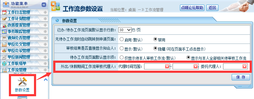 点晴OA系统工作流在审核人出差或请假时,如何设置委托其他人代办啊?
