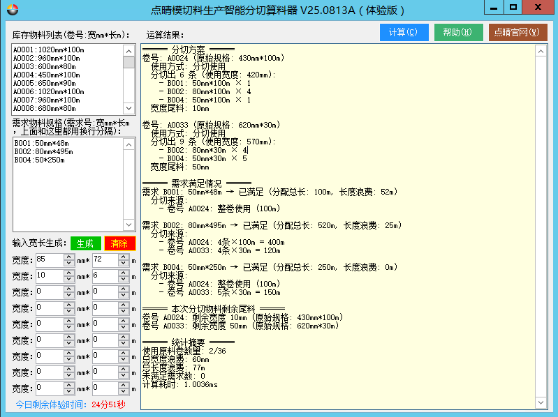 点晴ERP模切料生产智能分切算料器,是深圳市点晴信息技术有限公司专门为模切行业推出的一款模切材料生产分切管理智能算料的程序(从点晴模切ERP系统生产版中剥离出来为一个可以独立运行的程序),可以快速高效的给出最佳分切用料结果,实现最小分切卷数、最少浪费的目标。支持逾万个原始在库物料规格设置、数千个不同规格的生产物料需求在...