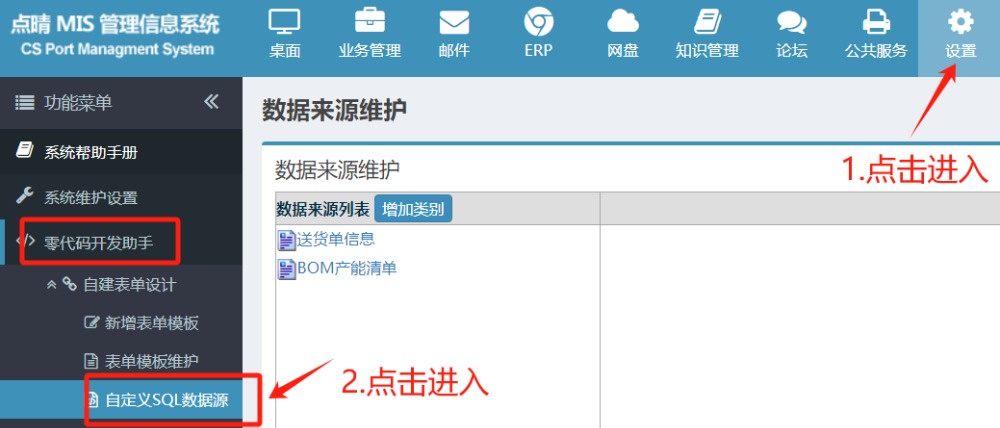 点晴ERP-零代码开发自定义数据源-操作教程 点击进入如下图:点击增加类别如下图:填写名称,然后点击增加如下图:然后填写数据库sql语句,示例:selectscm_deliver_goods_order.order_idasmain_info,scm_deliver_goods_order.client_nameas...