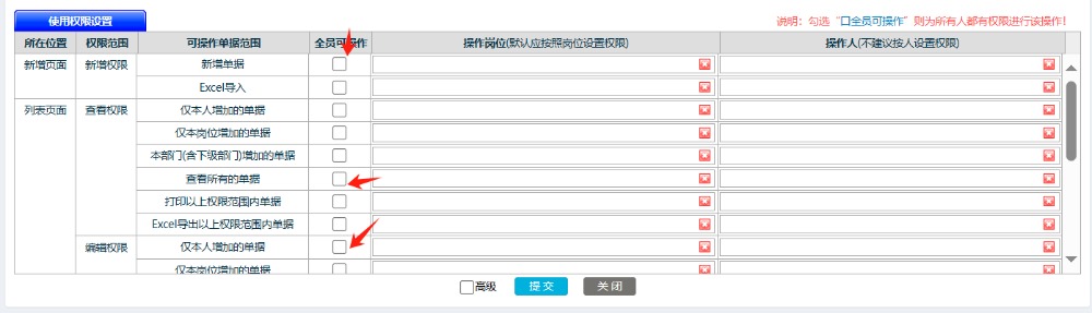 点晴ERP-零代码开发表单用户新增权限分配-操作教程 在页面设计最下方,有用户权限分配的勾选项,一般新增,查看权限为所有人的,其他都是本人的单据才允许操作如下图: