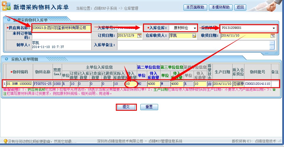 3、输入实际入库数量。填入必要信息后如下图所示:注:货位自动带出...