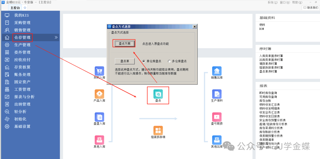 金蝶KIS专业版盘点单操作流程​上一篇详细介绍了金蝶KIS专业版盘点单的操作流程。然而,由于盘点单存在不能超过1000条分录的局限性,在物料种类繁多的制造企业中,盘点单功能难以发挥作用。此时,就需要借助盘点方案的功能。盘点基本流程:1.新建盘点方案2.盘点数据录入3.编制盘点报告4.盘盈盘亏处理盘点操作步骤:1、盘点备...