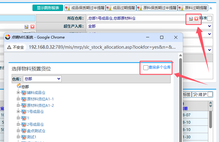 【点晴模切ERP】库存查询时如何实现一次性查询多个仓库的库存明细? 查询库存时,支持一次性选择多个仓库来查询,方法如下:在弹出的“选择物料预置货位”页面中,勾选右上角的“口查询多个仓库”,就可以继续在“所在仓库”中增加更多个仓库了,然后点击“查询”即可。 如果在“选择物料预置货位”页面中,没有看到右上角的“口查询多...