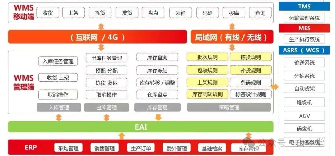 WMS系统管理所有实体货物流转出入,任何有实际货物的搬运、移动的库存作业都要记录。用两幅图来概要,图一为系统框架图(含外部系统集成):图2为系统功能概要:一、WMS核心功能框架1.1.核心作业管理(收发转盘存)入库管理-收货(扫码/手动录入)-上架(库位分配、实物放置)-入库通知(接收上游系统指令)出库管理-拣货(按订...