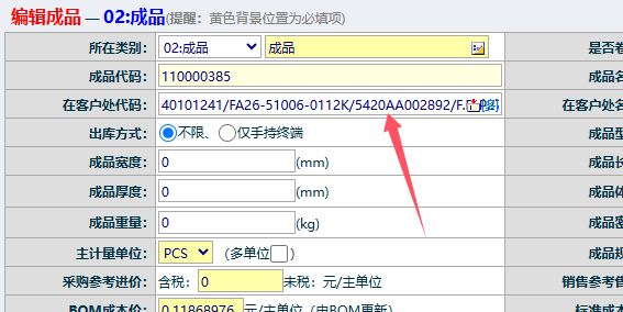 注意:需修改位置;大类、类别、单位、规格、货位、是否自产(若调整后的类别是成品且在是否自产栏若选择否,会造成成品工程BOM页面查不到对应的信息)