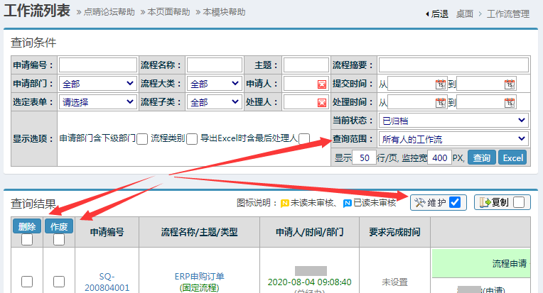 点晴OA工作流中已经归档的申请如何彻底删除或撤回? 覆水难收,已经归档的工作流申请,系统禁止普通员工直接删除,也不允许撤回,需要管理员登录OA系统,找到这个已归档的流程申请删除掉。 为避免引起误会和纠纷,建议管理员不要直接删除已经归档的工作流申请,应该创建一个“已归档工作流申请删除流程”,在申请内容注明申请删除的具...